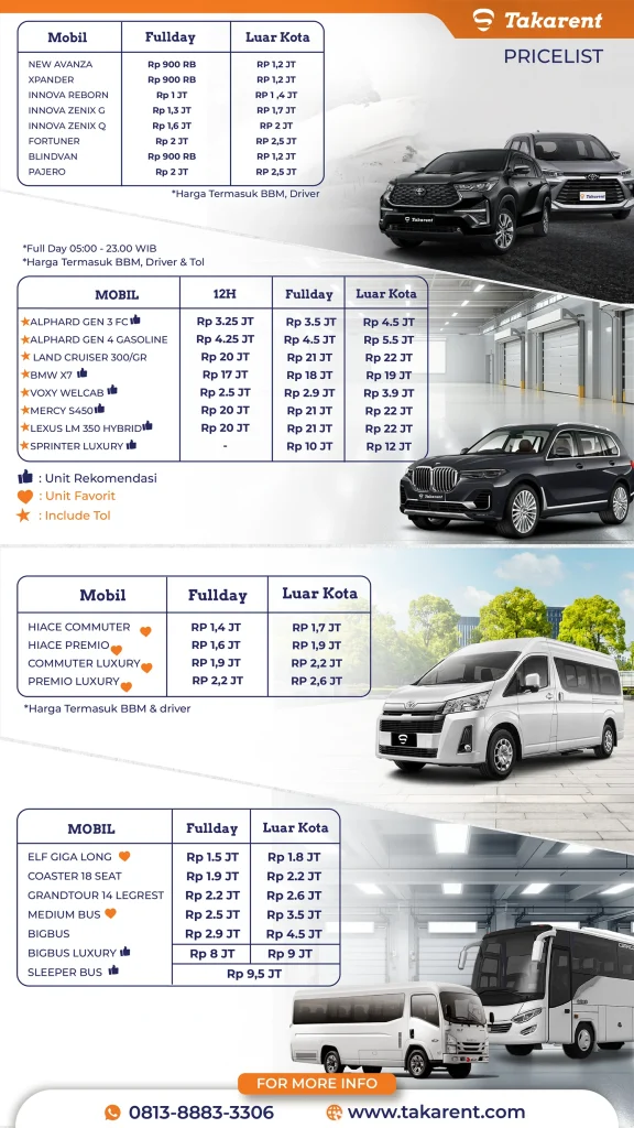 Takarent menyediakan berbagai pilihan kendaraan sewa, mulai dari city car hingga bus pariwisata, dengan tarif kompetitif dan pelayanan profesional. Semua armada kami dalam kondisi prima, lengkap dengan sopir berpengalaman dan perawatan rutin.